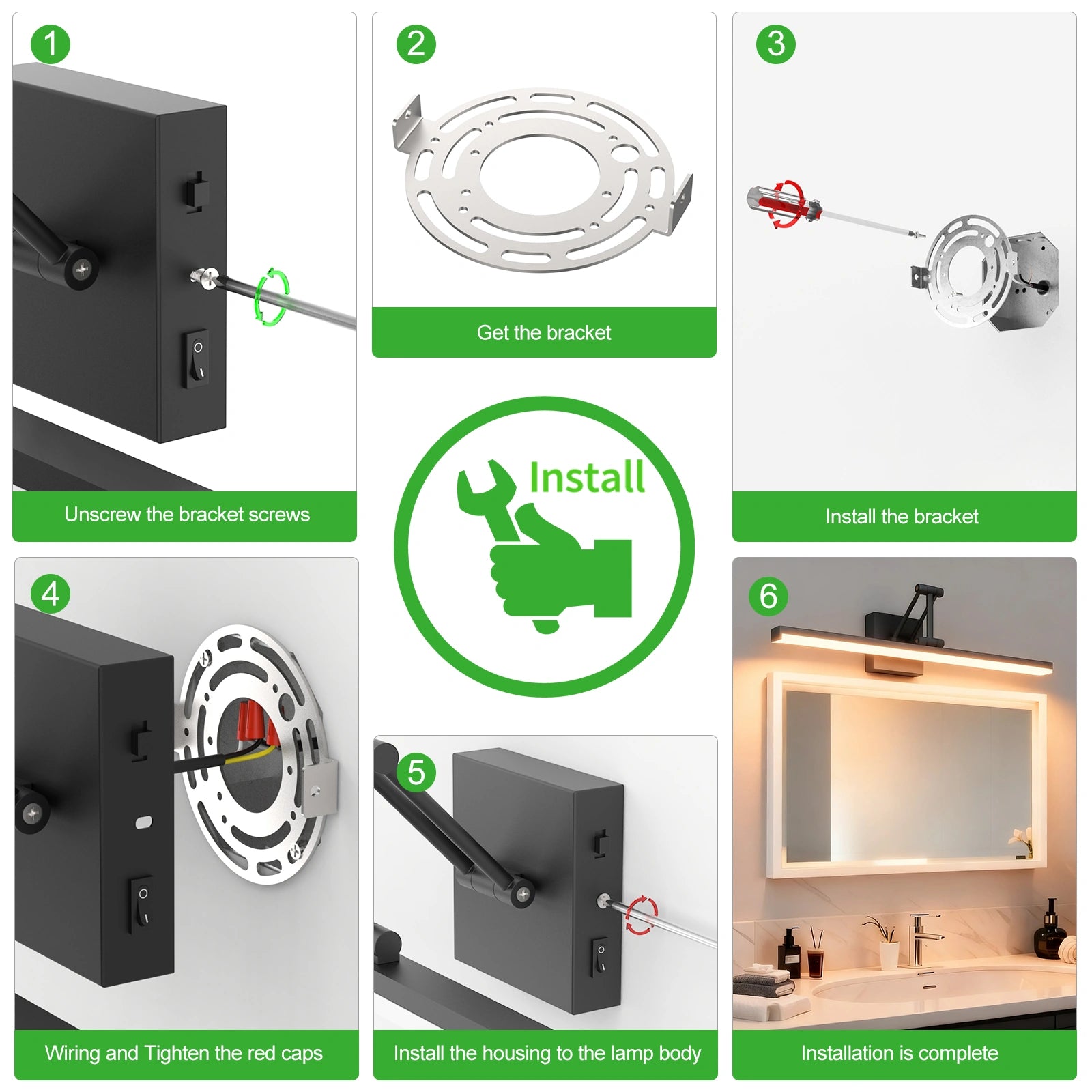 💡360° illumination for makeup and shaving💡 This mirror lamp features a foldable telescopic arm that extends up to 30cm (11.81 inches) from the wall. You can tilt the base of the arm 180° and the lamp head 350°. For close-up touch-ups or shaving, extend the lamp; otherwise, keep it folded. Please note that when installing the mirror light, please use a screwdriver to properly tighten the fixing screws on the telescopic arm.